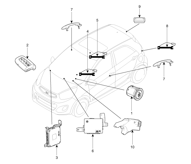 6. Module de commande de la carrosserie 7. Poignée de porte et antenne de porte 8. Antenne du pare-chocs 9. Interrupteur ouverture couvercle du coffre 10. ESCL (Verrouillage de la colonne de direction électronique) |